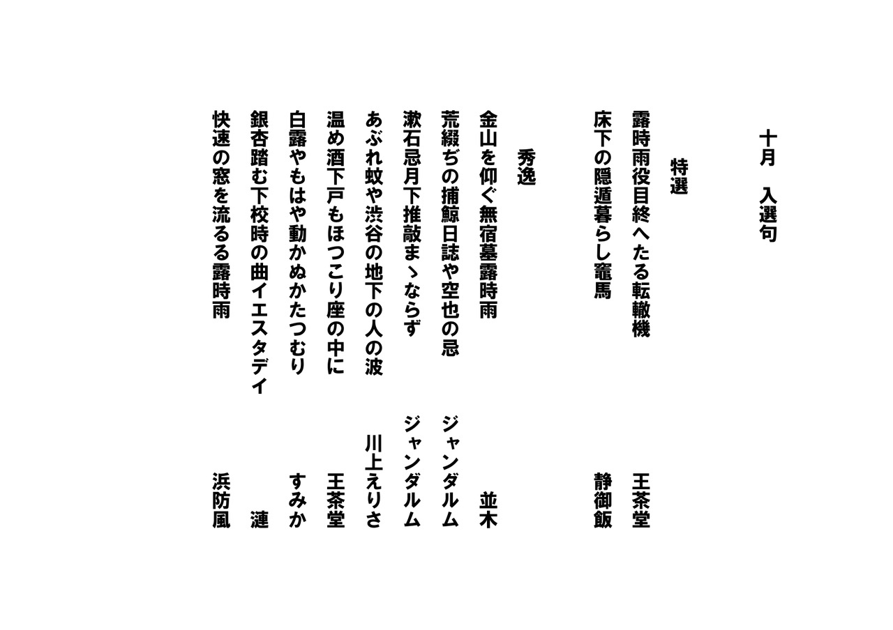 お待たせしました。10月は85句の投句をいただきました。ありがとうございます。