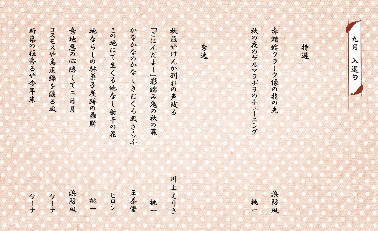 お待たせしました。9月は83句の投句をいただきました。ありがとうございます。