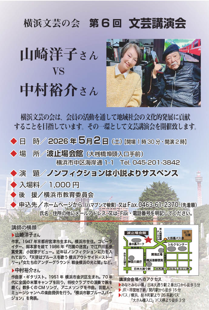 山崎洋子さんがご自身のブログ「冬桃」にこの対談の案内を載せています。 「港を眼下に、中村裕介さんとディープなヨコハマトーク!」5月2日(土) 大さん橋そばの波止場会館にてトークショーを行います。題して、「ノンフィクションは小説よりサスペンス」 フィクション(小説)は自由に創るもの。宇宙人が登場しようと密室殺人が起きようと書き手の勝手です。たとえ実在の人をモデルにしても「小説」と銘打てば、想像や創造をある程度入れ込むことができます。 でもノンフィクションとなるとそうはいきません。あくまで真実を求め、対象に密着します。 あと二年ほどで西暦2000年を迎えるという頃、初めてのノンフィクションを書くため、エディ潘という人を追いかけました。横浜を代表するブルースロック歌手。元ゴールデンカップスのリードギター。ソロ歌手になってからの代表作「横浜ホンキートンク・ブルース」は原田芳雄、松田優作、宇崎竜童など、多くの個性派俳優や歌手がカバーしています。 その取材が始まって間もなく、当初の目的とはまったく異なる世界が、エディさんの一言から出現しました。それはもう私にとって、思いもよらないサスペンス。書こうとしていた内容が180度ひっくり返るほどの衝撃でした。 その取材過程で大いに協力してくださったのがエディさんの親友でミュージシャンの中村裕介さん。そして上梓したのが「天使はブルースを歌う」「女たちのアンダーグラウンド」という二冊のノンフィクションです。 このたびのトークショーでは、中村さんに相手を務めてくださるよう懇願しました。本に書けなかったこと、いまだから言えること、ここだけの話……などなど、ディープな裏話もふくめて語り合います。 あれから25年以上もたっているので、横浜にも、人々にもさまざまな変化が起きました。エディ潘さんは昨年の5月永眠されました。彼の話もいっぱい出るでしょうが「おい、ちょっと俺にも言わせろよ!」と苦笑いしながら見守ってくれるでしょう。 もちろん中村裕介さんの歌も聴けます。 ギター伴奏は大森裕之さんです。 さほど広い場所ではないので、どうかお早目のお申し込みを! 文芸講演会のお申込みはこちら⇒ |